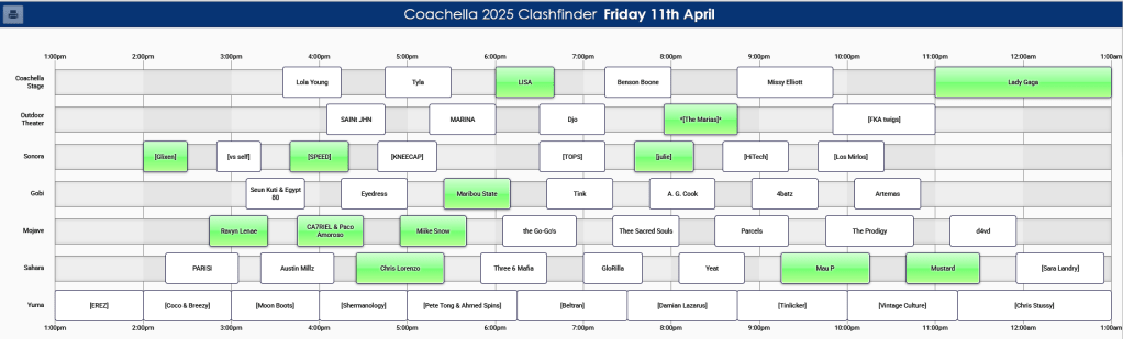 Coachella is designed for crowd control. This means a lot of tough set conflicts. Here’s how I personally choose sets, take what you need.